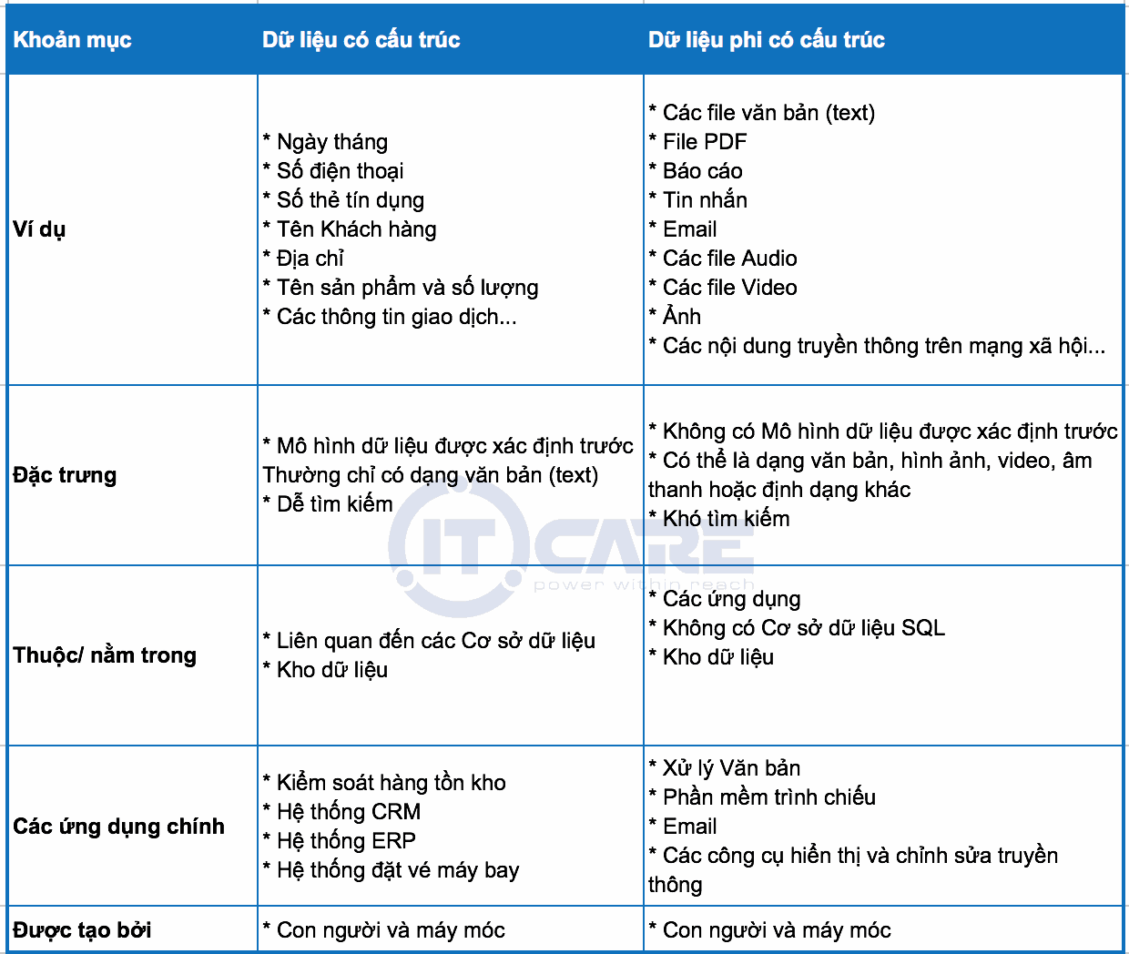 Bảng so sánh Dữ liệu có cấu trúc và phi cấu trúc
