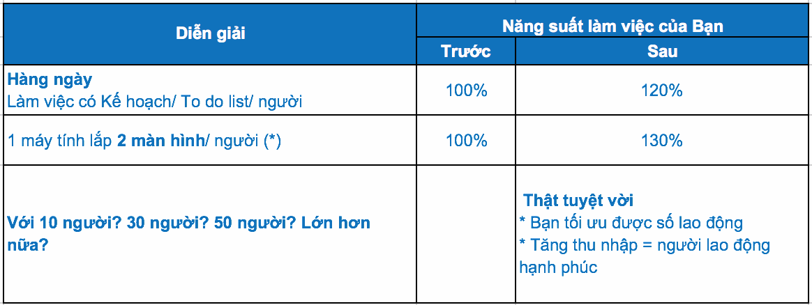 (*) Trải nghiệm thực tế từ Công ty Cổ Phần Cầu trục và Thiết bị AVC, 100% nhân viên 3 miền Bắc, Trung, Nam đều sử dụng 2 màn hình để làm việc. Theo đánh giá của Ông Hoàng Tư Khoa Chủ tịch HĐQT, Tổng Giám đốc Công ty AVC: