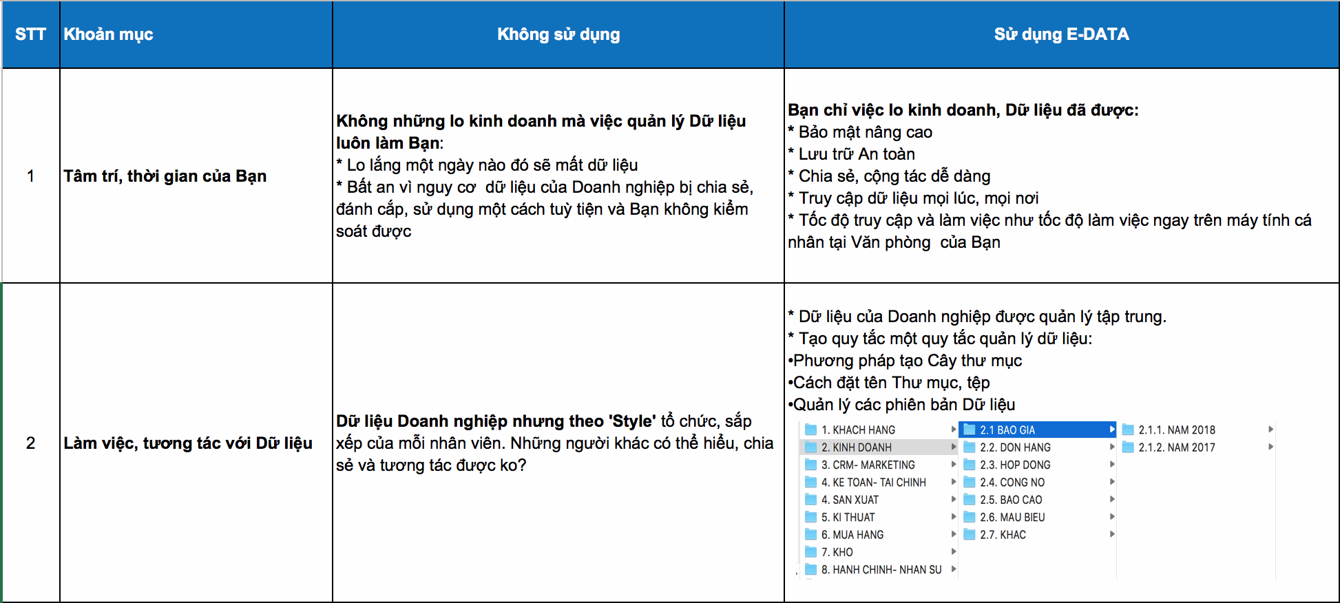E-Data là nơi Dữ liệu của Doanh nghiệp được Lưu trữ, truy cập và chia sẻ tại một nơi An toàn- Bảo mật và Ổn định. Bạn có thể truy cập trực tiếp vào Dữ liệu ngay từ máy tính, thiết bị di động mà không cần dùng trình duyệt Web với tốc độ cao. Dữ liệu được cấu trúc, sắp xếp theo quy tắc. Người dùng được cấp quyền có thể Truy cập, làm việc mọi lúc mọi nơi.